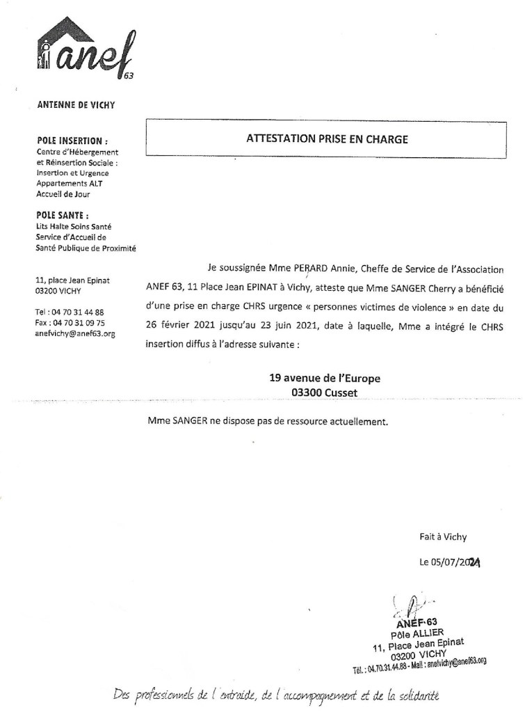 Elles ont été placées illicitement dans un foyer ANEF 63.(Pièce 2). Fait que je n’ai pu vérifier puisque dans la décision du 05 avril 2022 du tribunal de proximité de Vichy, il est écrit que mes enfants ont été livrées à l’inconnu Thierry Guérin, sans protection aucune: