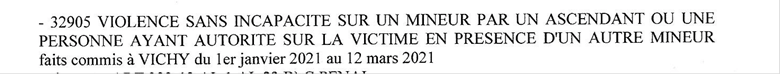 32905 VIOLENCE SANS INCAPACITE SUR UN MINEUR PAR UN ASCENDANT OU UNE PERSONNE AYANT AUTORITE SUR LA VICTIME EN PRESENCE D’UN AUTRE MINEUR faits commis à VICHY du ler janvier 2021 au 12 mars 2021