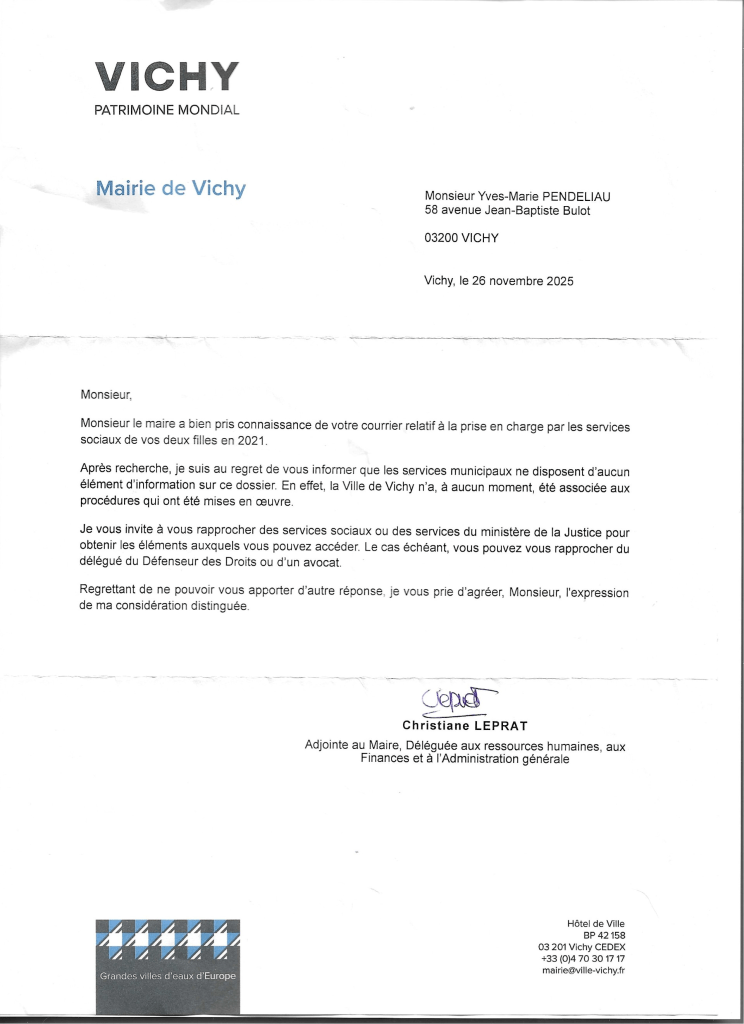 C’est la faute de Madame le juge de Cusset Elsa Aussavy qui a privé mes enfants du secours d’un père durant deux ans à partir du 28 septembre 2021,sans mettre en place aucune mesure de protection.: