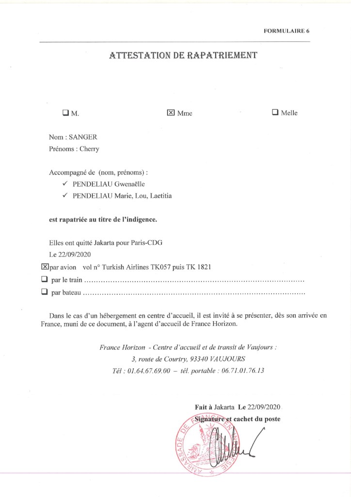 Les 22 et 23 septembre 2020, ma famille a été rapatriée de l’Indonésie vers Vichy au titre de l’indigence (Pièce 1).