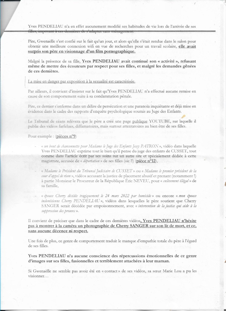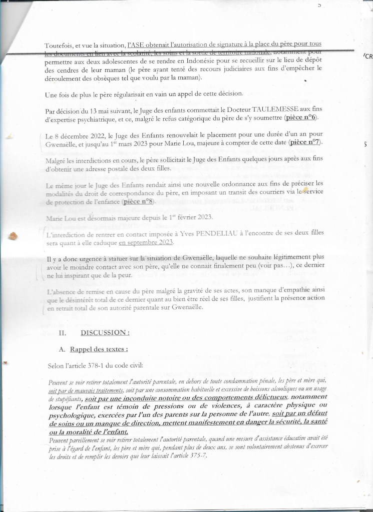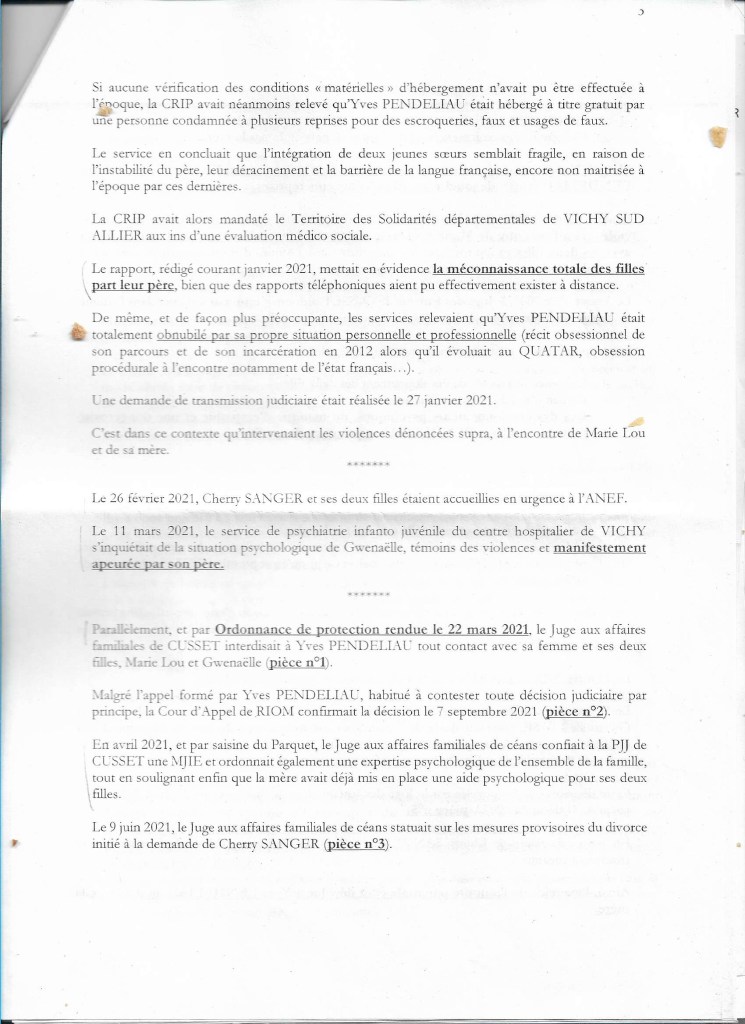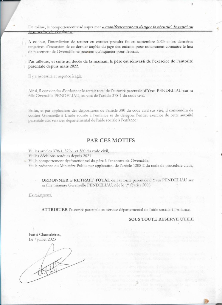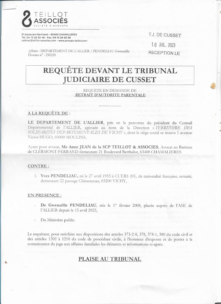 Quant à monsieur le président de l’ASE, il est probablement l’instigateur de cette situation sous couvert de monsieur le préfet de l’Allier. La preuve en est sa requête ci-jointe en déchéance de mon droit parental déposée au tribunal de Vichy le 10 juillet 2023. Sans aucun justificatif, le président y déblatère les pires horreurs à mon encontre.